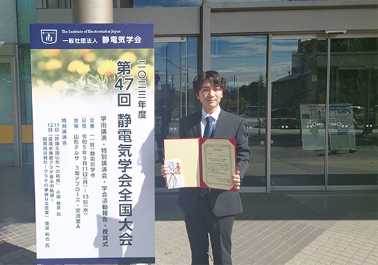 修士1年の手島大智さんが静電気学会全国大会で「宍戸奨励賞」を受賞しました.