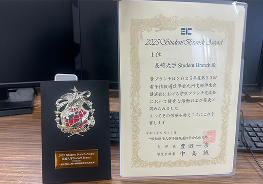 長崎大学Student Branch(会長:白石倭士 副会長:大久保幸哉)が電子情報通信学会九州支部にて 2025 Student Branch Awardを受賞しました。